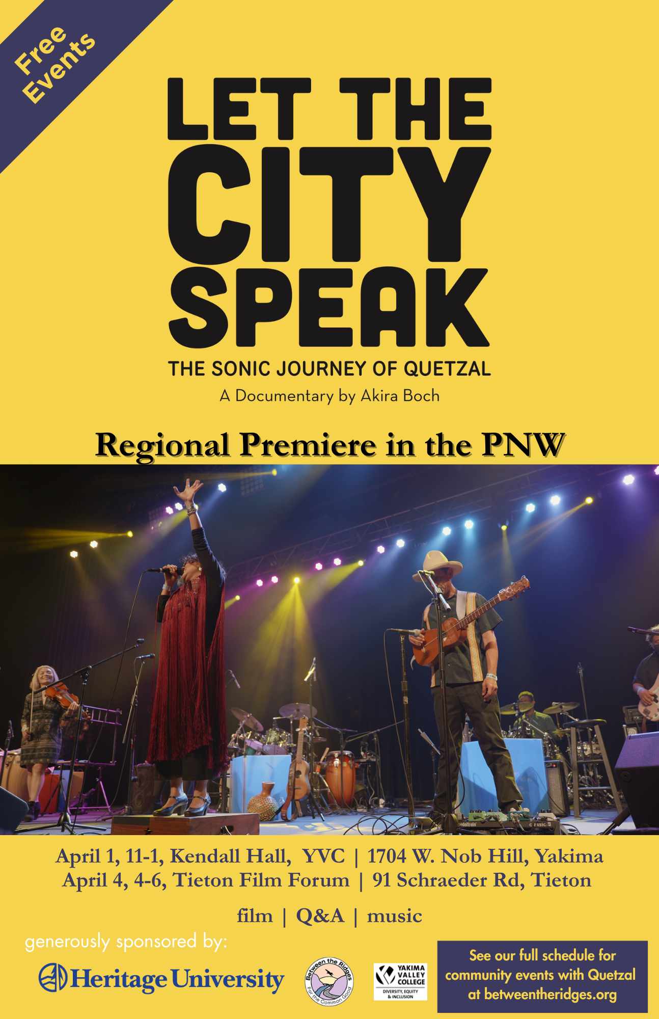Let the City Speak is a week-long, valley-wide series of workshops, conversations, film screenings, and a free community concert featuring Quetzal, the Grammy Award–winning East L.A. band known for community-based cultural and social-justice organizing. The series of events brings together organizers, youth, artists, students, farmworker families, and neighbors to share stories, build connections and create collective music rooted in lived experience. Event Components Include Tuesday March 31, 6 pm Dinner, Collective Song Writing with Quetzal Flores, St Michael's Mission. Wednesday, April 1, 11-1 pm Documentary, Music, Q&A, Kendall Hall, YVC, Yakima Thurs, April 2, 1-3 pm Collective Song Writing Workshop with [...]